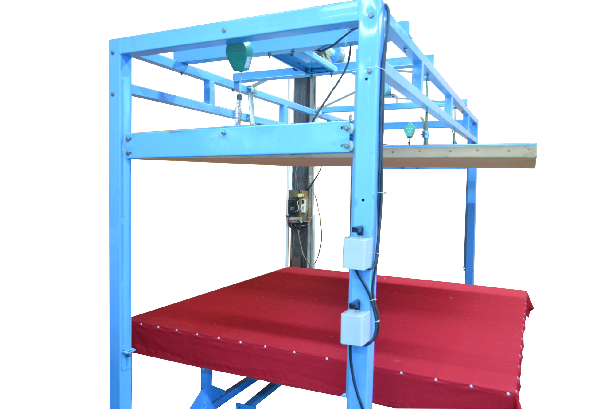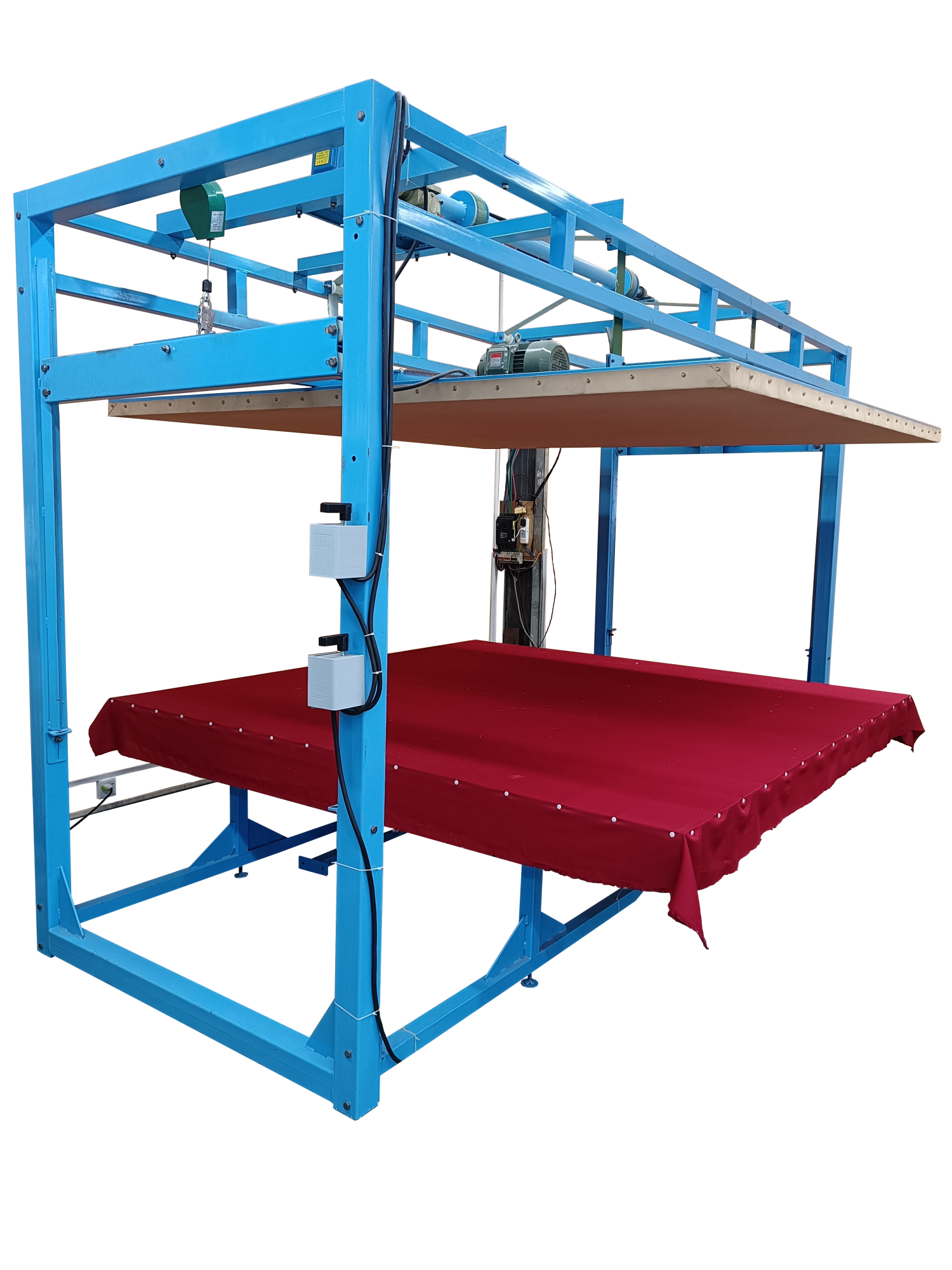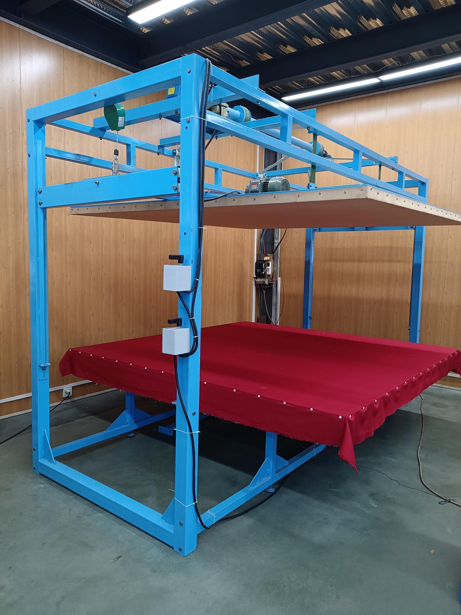 本全自動(dòng)揉棉機(jī)為徽星機(jī)械機(jī)械制造有限公司研發(fā)新型產(chǎn)品,該全自動(dòng)揉棉機(jī)由傳統(tǒng)的上傳動(dòng)方式,改為下傳動(dòng)方式。上傳動(dòng)全自動(dòng)揉棉機(jī)的主要缺點(diǎn)是噪音高,振動(dòng)副度比較大,安裝時(shí)要配合地錨來(lái)固定機(jī)器,本新型機(jī)器(全自動(dòng)揉棉機(jī))的下傳動(dòng)裝置改變了以上的缺點(diǎn)。新一代全自動(dòng)揉棉機(jī)(揉磨機(jī))操作方便,易于使用。適用于棉胎成型加工廠、踏花被廠、棉胎加工個(gè)體戶使用;全自動(dòng)揉棉機(jī)揉制的棉胎(絮)平整、美觀、結(jié)實(shí)、耐用,全自動(dòng)揉棉機(jī)(揉磨機(jī))使傳統(tǒng)的人工強(qiáng)體力勞動(dòng)變?yōu)楸鞠盗袡C(jī)器的自動(dòng)化機(jī)械作業(yè),特別是自動(dòng)升降系統(tǒng)和定時(shí)揉棉設(shè)定,大大減輕了工人的勞動(dòng)強(qiáng)度、提高了勞動(dòng)效率。并且一人可看管多機(jī),效益非常顯著。全自動(dòng)揉棉機(jī)其原理是電機(jī)帶動(dòng)偏心運(yùn)轉(zhuǎn)使上揉板運(yùn)動(dòng),將棉鋪磨平、壓緊,使棉纖維與網(wǎng)線結(jié)合,成型棉胎。